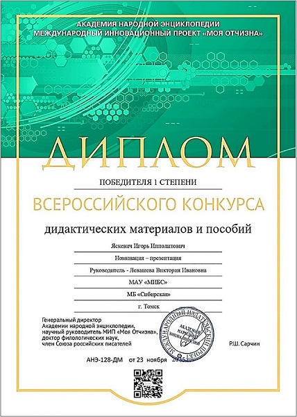 стал победителем Всероссийского конкурса дидактических материалов и пособий Во второй половине 2025 года нашему коллеге, в течение десяти лет бывшему редактором альманаха «Лира» и бессменным сценаристом почти всех театрализованных арт-проектов членов творческого литературного клуба «Слово» гимназии № 26 города Томска, лауреату международной литературной премии «Золотое перо Руси-23» – ИГОРЮ ИППОЛИТОВИЧУ ЯСКЕВИЧУ пришло письмо с приглашением принять участие во Всероссийском конкурсе дидактических работ, рассказывающих о практике творческих союзов и объединений в учреждениях образования в части пропаганды и укрепления дружбы народов нашей страны. Будучи членом томского краеведческого клуба «Сибирский краевед», руководимого главным библиотекарем муниципальной библиотеки «Сибирская» ВИКТОРИЕЙ ИВАНОВНОЙ ЛЕВАШЕВОЙ, Игорь Ипполитович сумел под её редакторством создать презентацию из 38 слайдов, в которой в увлекательной форме рассказал о более чем десятилетней работе творческого клуба «Слово», ставшего за годы своей деятельности подлинной кузницей дружбы для его членов – молодых представителей самых разных наций и народностей, живущих в городе Томске – старейшем университетском центре Сибири.И эта работа стала победительницей в конкурсе, что было подтверждено соответствующим Дипломом, а также она была рекомендована академиками – членами жюри, как пример для школьных учителей и преподавателей вузов России. 01.01.2026