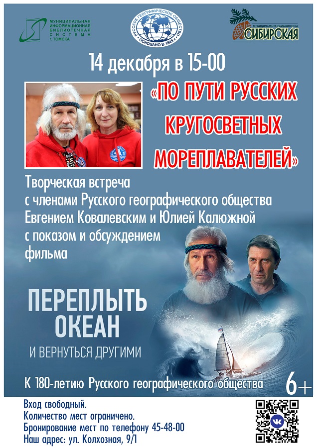 14 декабря в 15-00 в модельной библиотеке «Сибирская» (ул. Колхозная, 9/1) пройдёт творческая встреча с членами Русского географического общества ЕВГЕНИЕМ КОВАЛЕВСКИМ и ЮЛИЕЙ КАЛЮЖНОЙ. Организаторы кругосветной экспедиции «По пути русских кругосветных мореплавателей» расскажут о памятных моментах путешествия и представят документальный фильм «Переплыть океан. И вернуться другими». Гостей библиотеки ждёт знакомство с руководителем экспедиции «По пути русских кругосветных мореплавателей» (Russian Ocean Way) Евгением Ковалевским и главой Берегового штаба Юлией Калюжной. Мероприятие приурочено к 180-летию Русского географического общества. Вход свободный. Количество мест ограничено. Бронирование мест по телефону 45-48-00 в часы работы библиотеки: вторник – воскресенье с 9.00 до 20.00, или на страницах социальной сети библиотеки «Сибирская» Вконтакте. Без предварительной записи посадочные места не гарантируются! 05.12.2025 г.