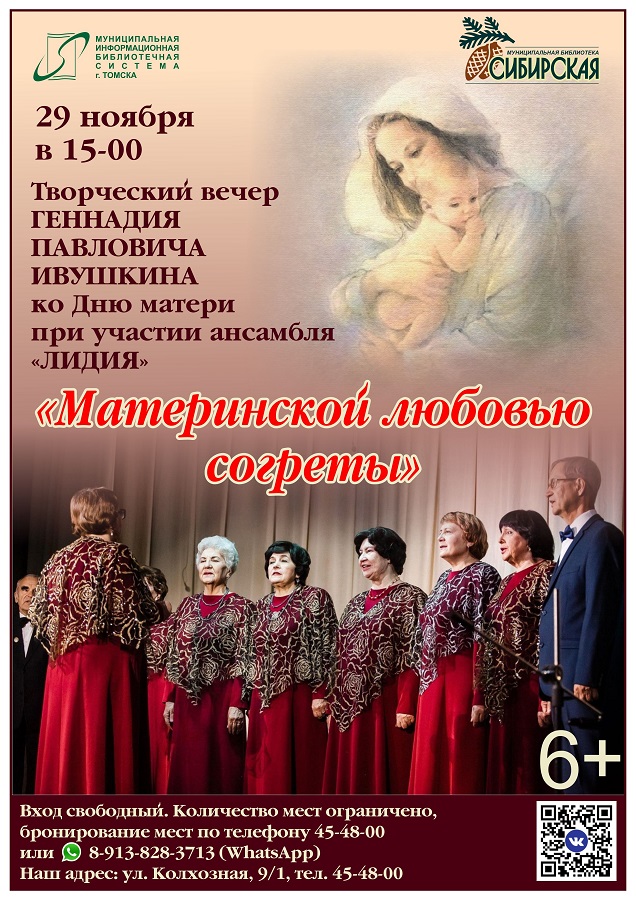 29 ноября в 15-00 в модельной библиотеке «Сибирская» (ул. Колхозная, 9/1) ко Дню матери пройдёт авторский творческий вечер «Материнской любовью согреты». Томский поэт и музыкант ГЕННАДИЙ ПАВЛОВИЧ ИВУШКИН при музыкальной поддержке народного вокального ансамбля «ЛИДИЯ» представит читателям свой сборник стихотворений «МОИ ТРОПИНКИ» и расскажет о жизни и творчестве.В концертной части программы в исполнении ансамбля «Лидия» прозвучат стихи и песни российских и томских поэтов, посвящённые маме, а также несколько авторских стихотворений и музыкальных композиций Г.П. Ивушкина. Вход свободный. Количество мест ограничено. Бронирование мест по телефону 45-48-00 или 8-913-828-37-13 (WhatsApp) в часы работы библиотеки: вторник – воскресенье с 9.00 до 20.00. 13.11.2025 г.