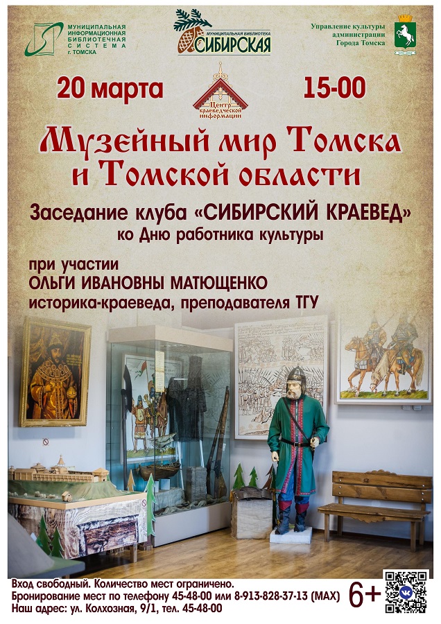 20 марта в 15-00 в модельной библиотеке «Сибирская» (ул. Колхозная, 9/1) состоится заседание клуба краеведов «МУЗЕЙНЫЙ МИР ТОМСКА И ТОМСКОЙ ОБЛАСТИ» ко Дню работника культуры. Специальный гость – историк-краевед, преподаватель кафедры музеологии, культурного и природного наследия (ныне кафедра культурологии и музеологии) Института искусств и культуры Томского государственного университета ОЛЬГА ИВАНОВНА МАТЮЩЕНКО. Ольга Ивановна проведёт подробный обзор как уже долгое время существующих, так и совсем недавно открытых музеев, а также только проектируемых. Всего музеев в нашей области около 300 и каждый из них уникален: одни рассказывают о прошлом региона, другие знакомят с искусством или научными достижениями. Будут представлены самые интересные и необычные музеи города Томска – государственные и ведомственные, муниципальные и частные, военные и под открытым небом, исторические, художественные, научные, технические и др. Члены клуба «Сибирский краевед» расскажут о своих любимых музеях Томска и Томской области. Приглашаем всех любителей истории родного края присоединиться к клубу «Сибирский краевед» при муниципальной библиотеке «Сибирская» по адресу: ул. Колхозная, 9/1. Телефон для справок 45-48-00. 12.03.2026 г.