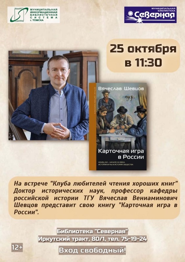 25 октября в 11-30 в муниципальной библиотеке «Северная» (Иркутский тракт, 80/1) пройдёт встреча «Клуба любителей хороших книг», гостем которой станет доктор исторических наук, профессор кафедры российской истории ФИПН ТГУ, автор монографии «Карточная история России» В. В. ШЕВЦОВ.В рамках встречи спикер представит свою книгу, расскажет о многолетних исследованиях феномена карточной игры в России с точки зрения истории, психологии и культуры, а также ответит на вопросы читателей. Авторская работа «Карточная история России» вышла в 2025 году в одном из крупнейших российских издательств АСТ. В книге рассматривается история игры в контексте развития общества, основные особенности и классификация игр, поведение игроков, литературные отсылки и многое другое. Презентация будет интересна всем, кто изучает историю и культуру России, а также хочет расширить свой кругозор. Вход свободный. |