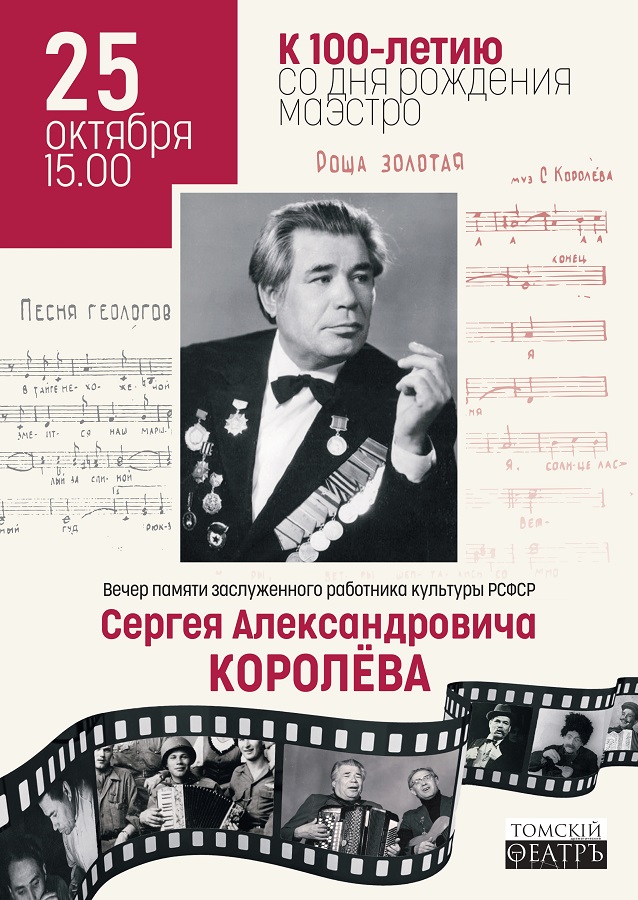 25 октября в 15-00 в Томском областном театре драмы пройдёт вечер памяти заслуженного работника культуры РСФСР Сергея Александровича Королёва.СЕРГЕЙ АЛЕКСАНДРОВИЧ КОРОЛЁВ – легенда театрального Томска. Заслуженный работник культуры РСФСР, бессменный заведующий музыкальной частью Театра драмы на протяжении многих лет, композитор, герой Великой Отечественной войны, кавалер многих орденов и медалей – он был необычайно ярким и талантливым человеком. Сергей Александрович сочинил музыку к огромному количеству спектаклей, и многие его песни, как, например, «Роща моя золотая…», «Живая память», «Женщины стоят на берегу» стали популярными далеко за пределами театра. Композитор, дирижёр, актёр – это только немногие из ипостасей Сергея Александровича. Вместе с другом и многолетним театральным партнёром, отличным гитаристом, тоже фронтовиком, актёром ВЛАДИМИРОМ СЕМЁНОВЫМ они организовали прославленный творческий дуэт и объездили с концертами всю Томскую область, включая самые маленькие посёлки. 25 октября исполняется 100 лет со дня рождения маэстро. На вечере, посвященном памяти Сергея Александровича, прозвучат его песни в исполнении творческих коллективов Томска и Северска. Музыкальную часть программы дополнят тёплые воспоминания друзей и коллег маэстро. 21.10.2025 г.