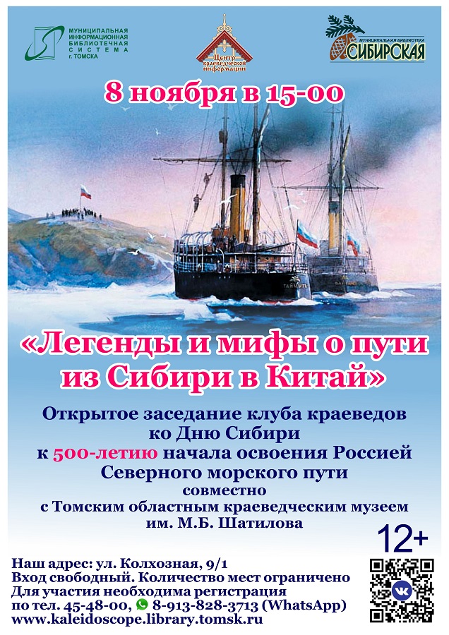 8 ноября, в День Сибири в 15-00 в модельной библиотеке «Сибирская» (ул. Колхозная, 9/1) состоится открытое заседание клуба краеведов «Легенды и мифы о пути из Сибири в Китай» к 500-летию начала освоения Россией Северного морского пути.Мероприятие проводится совместно с Томским областным краеведческим музеем им. М.Б. Шатилова. В декабре 1525 года русским дипломатом Дмитрием Герасимовым была выдвинута гипотеза о возможности добраться из Европейской части в Китай через Северный Ледовитый океан. Хотя сам термин «Северный морской путь» появился значительно позже, и серьезно осваивать маршрут начали только в XX веке, именно эта дата считается отправной точкой в изучении арктических вод для навигации. Старший научный сотрудник ТОКМ им. М. Б. Шатилова Марина Геннадьевна Лоскутова поделится легендами и мифами, которые связаны с историей освоения Северного морского пути (СМП) и роли в этом Томской области. 30.10.2025 г.